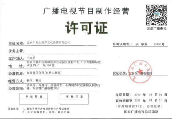 2、許可證(文件)名稱:《廣播電視節(jié)目制作經(jīng)營許可證》