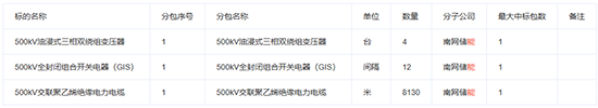 2.2招標(biāo)范圍:包括500kV油浸式三相雙繞組變壓器,500kV全封閉組合開關(guān)電器(GIS),500kV交聯(lián)聚乙烯絕緣電力電纜;需求單位為南網(wǎng)儲(chǔ)能公司。